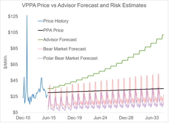 The problem is that a plain vanilla, fixed-price PPA implies a risk not every off-taker is willing to assume. This type of deal has been dubbed the “Hockey Stick PPA,” because the off-taker’s goal of managing their relative and absolute energy costs, as described above, is only achieved if the market price follows a trajectory that bends upward like a hockey stick, that is, an incrementally increasing trajectory. The chart below illustrates this concept, with the blue line representing the commonly provided forecast for long-term energy prices. One may suggest that going long at a fixed price “takes risk off the table,” but the reality is that one has simply exchanged one risk (rising prices) for another (falling prices). If a buyer ends up “long and wrong,” that buyer receives a fixed price while the market enjoys lower prices, thus creating a competitive disadvantage for an extended period of time. Again, this might be acceptable for some firms, but for the majority, it may end up doing more harm than good.